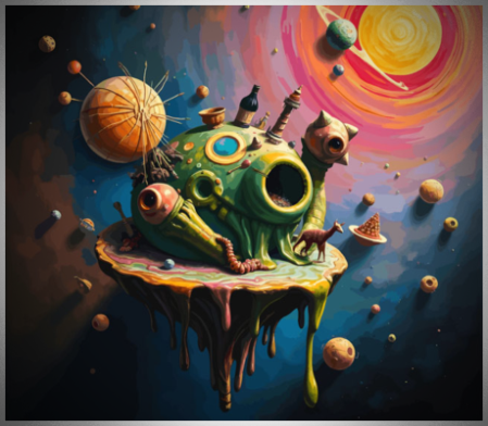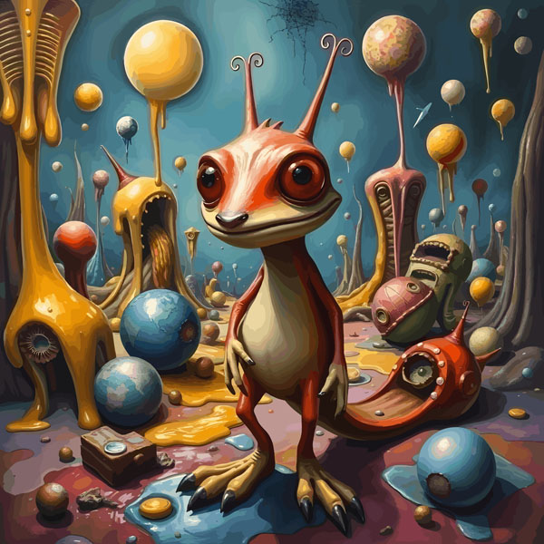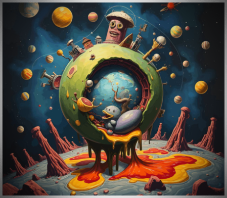 Auf Glibberon-7 breiteten sich unzählige Ströme farbigen Schleims aus. Sie formten Täler, lösten sie wieder auf, schufen leopardengefleckte Ebenen und ließen ganze Felder aus hüpfenden, schimmernden Kugeln entstehen. Die Oberfläche des jungen Planeten pulsierte wie ein lebender Regenbogen. Mitten in diesem wilden Entstehungstanz fand sich ein merkwürdiges Objekt wieder, dessen Herkunft niemand je erklären konnte: der geheimnisvolle Brutkasten Incubator. Und in diesem Brutkasten begann etwas zu wachsen. Aus den warmen, glibbrigen Schichten erhoben sich schließlich die ersten Bewohner des Planeten: die schillernden, teils formenwandelnden S46rz. Sie glitten, gluckerten und glitzerten – und machten Glibberon-7 zu dem kunterbunten, unberechenbaren Ort, den man heute kennt.
