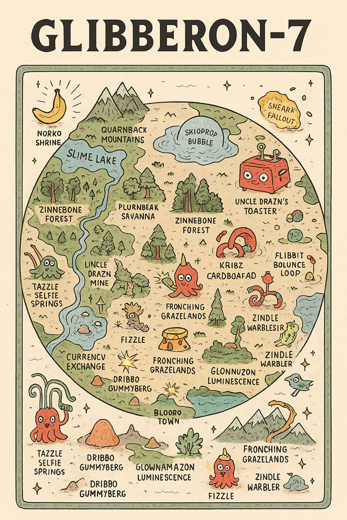 Die Geburt des GlibbersEs begann alles mit einem einzigen, leicht verwirrten Schimpansen-Astronauten – dem wagemutigen Forscher Captain Plongo, der sich während einer frühen Weltraummission in den unendlichen Galaxien verirrte.In seinem kleinen, klappernden Raumschiff befanden sich nur drei Dinge, die ihm Gesellschaft leisteten: sein geliebter Flummiball, eine Portion bunten Spielschleims und ein halbes Dutzend Bananen. Doch in einem unglücklichen Moment schwebte alles frei, kollidierte, verknotete sich – und explodierte schließlich in einem gewaltigen, gleißenden Mini-Urknall.
