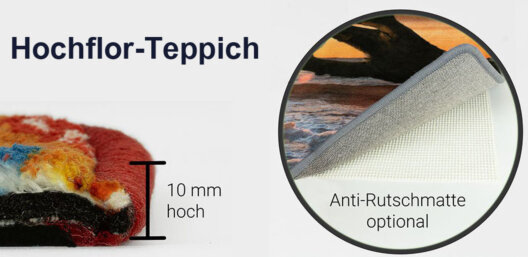 Mit einem Gewicht von ca. 1520 g/m² und einer Florhöhe von ca. 10 mm setzt der Hochflor-Teppich mit S46rz Motiv neue Maßstäbe in Sachen Komfort und Qualität. Gefertigt aus 100% Polyester, ist er nicht nur außerordentlich kuschelig, sondern auch pflegeleicht. Der hochwertige Druck mit Öko-Tex Farben sorgt dafür, dass die ausgewählten S46rz Motive in brillanten und gesundheitlich unbedenklichen Farben erstrahlen.